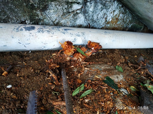Ab und zu gab es auch mal Problemchen, wie hier. Ein Baum waechst direkt unter dem Rohr. |