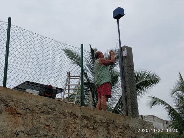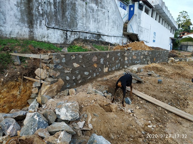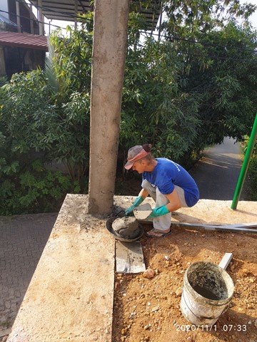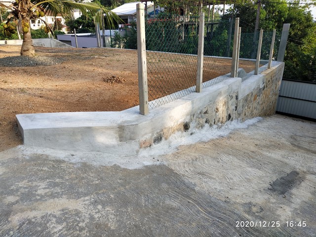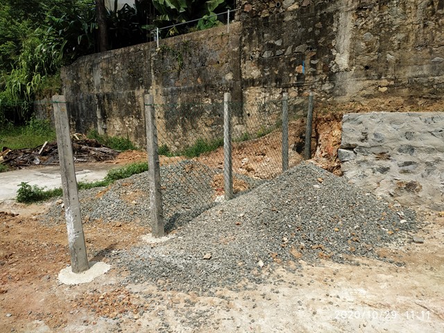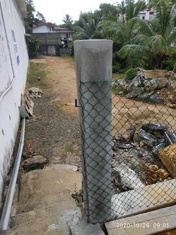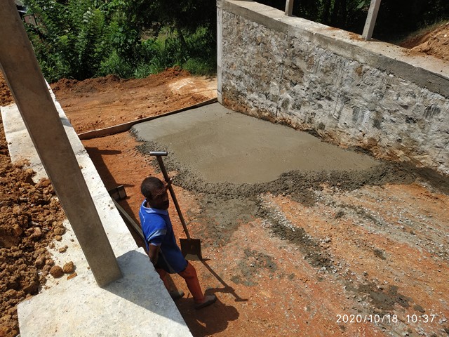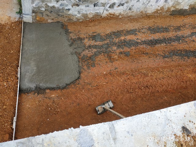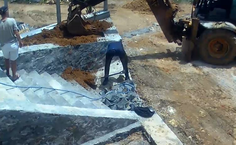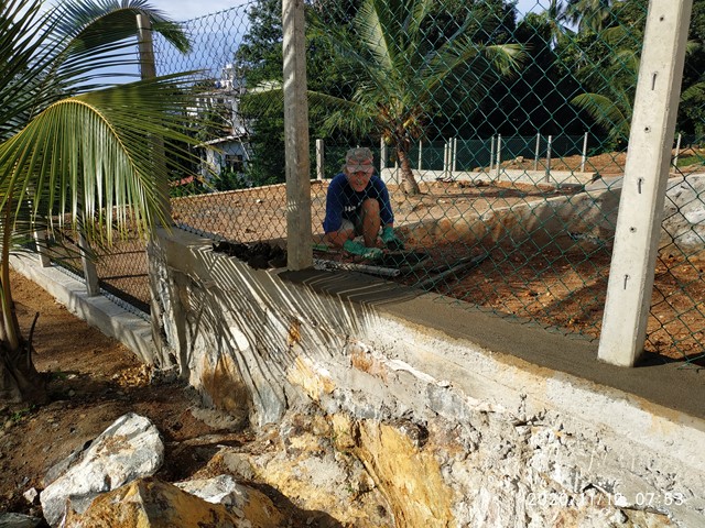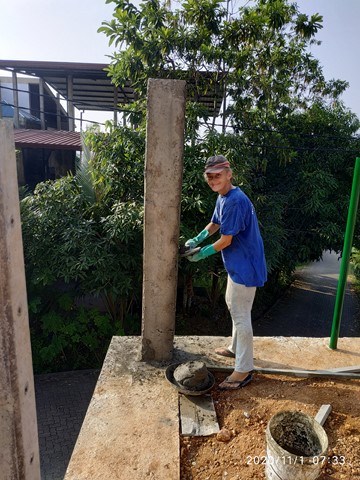 mit Zement ausgegossn wird. Waehrend dessen werden die Pfeiler fuer den Zaun gesetzt. |