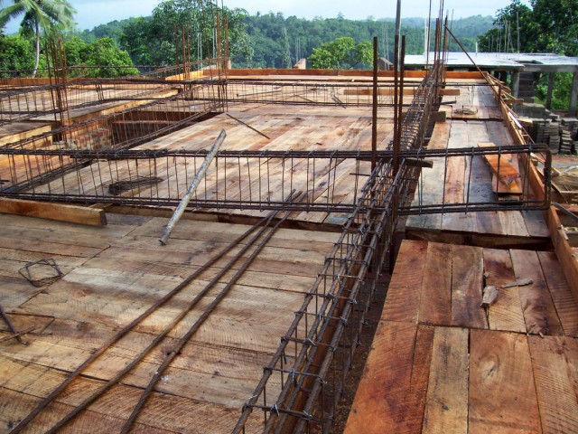 Hier sieht man gut das Holz mit den Trägern, wo später der Beton drauf kommt. Eine Decke bzw. Fußboden kann bis zu 10 Stunden dauern, da es in einem Stück gegossen werden muss. |
