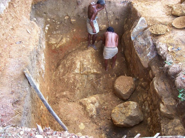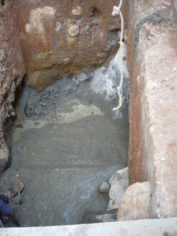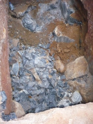 Hier haben wir unsere Probleme. Jetzt wird so gut es geht begradigt mit Hammer und Meißel. Manchmal wird auch ein Loch gebohrt und gesprengt. |