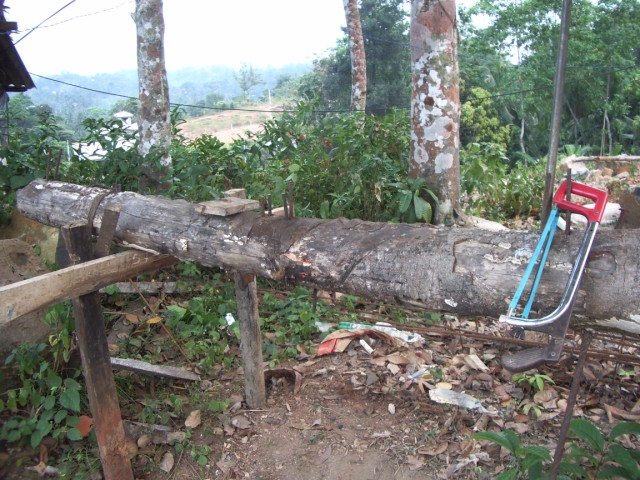 Eine Werkbank, eigentlich ist es mehr eine Biegebank. Ein langer Baumstamm, in den die Nägel so gesetzt werden, das die Stahlstangen dann wie gewünscht gebogen werden können.