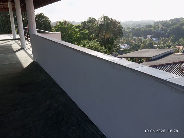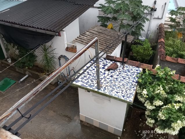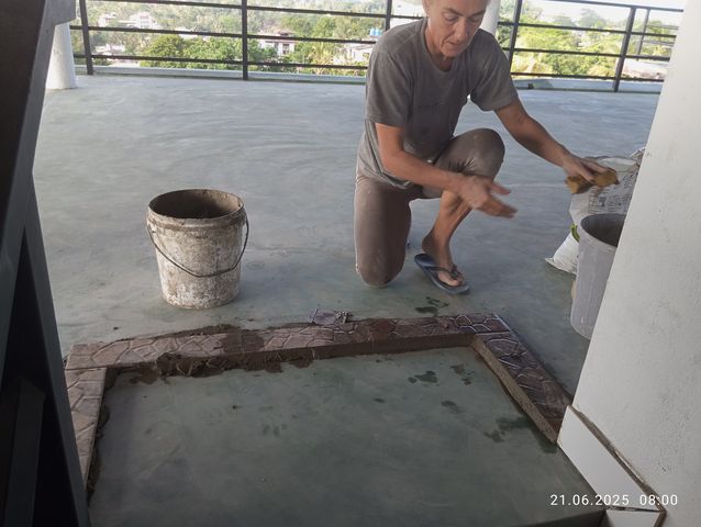 | Wenn sie schon mal dabei ist, dann ist sie nicht mehr aufzuhalten. So hat sie auch die ... | ... Maueroberseiten gefliesst. Laesst sich dann auch besser sauber machen. |