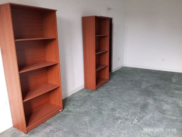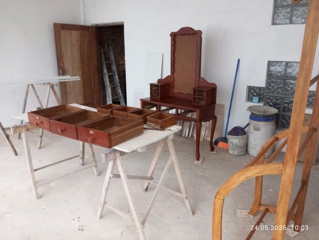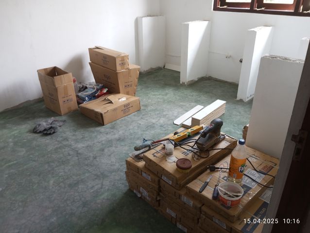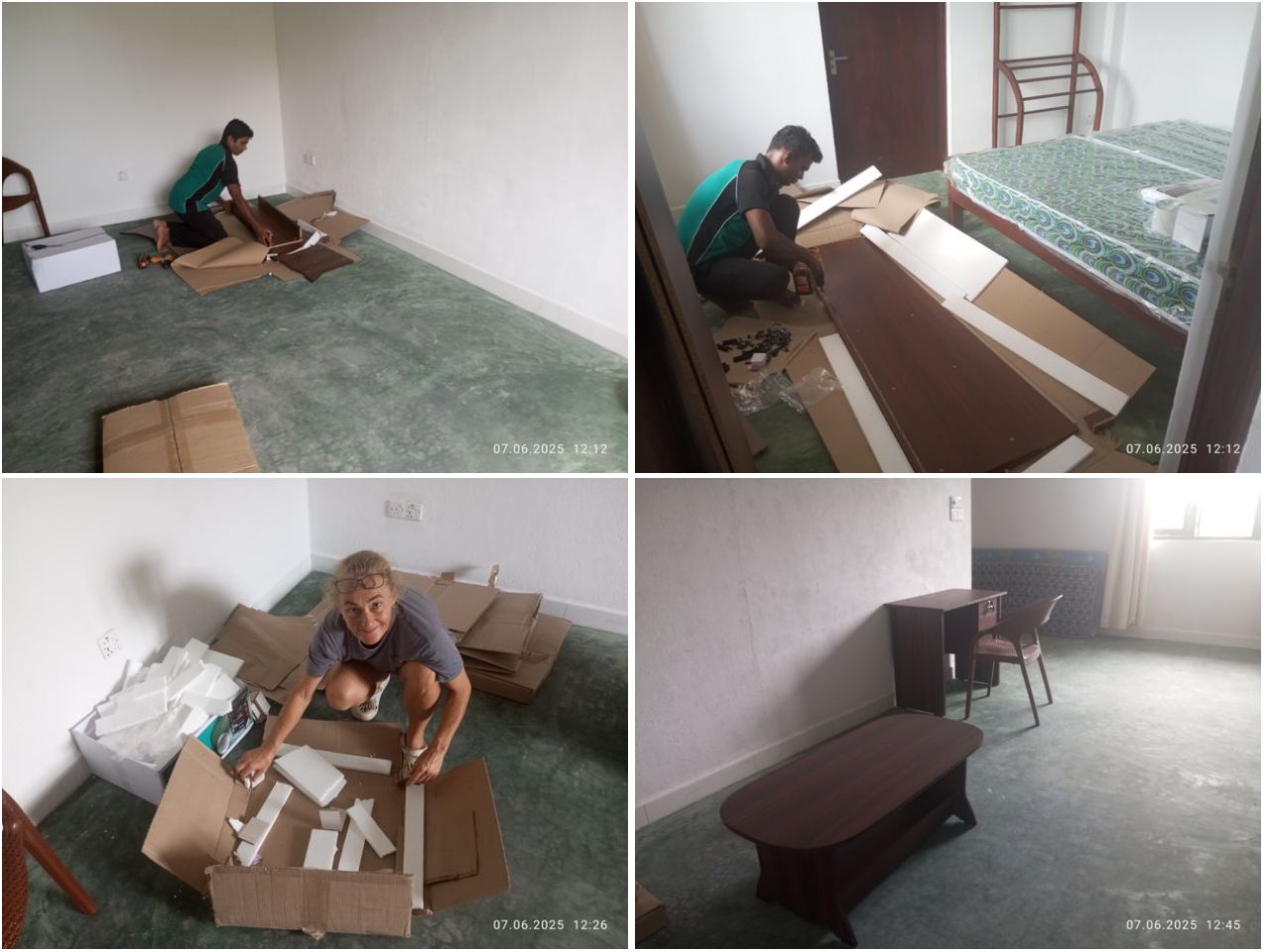 | Endlich kommen Schrank, Schreibtisch und Tisch. Wurde von denen sogar zusammen... | ...gebaut. Das Regal haben die Deiters spendiert. |