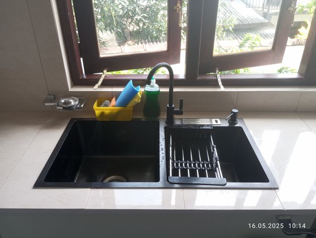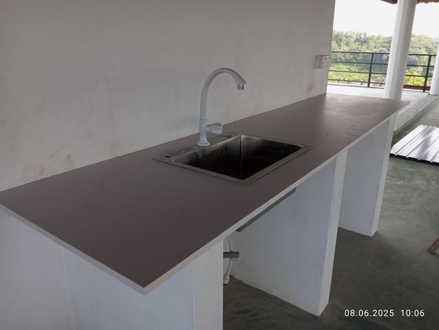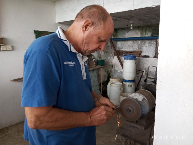 | Jacky saegt das Loch fuer die Spuele aus. Video 45 | Um anschliessend die Spuele mit Amatur einzubauen. |