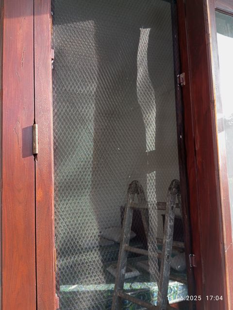 Frau des Hauses sitzt zwar, aber nicht untaetig. Die Aussentueren