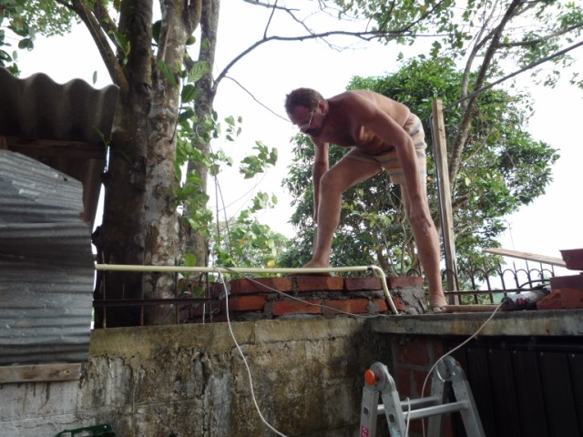 Lutz beim Abdecken des Daches. Und dann ging alles ganz schnell. Fundament