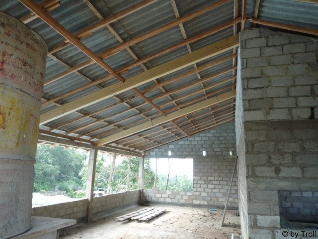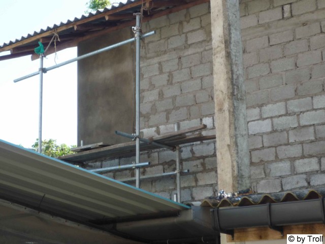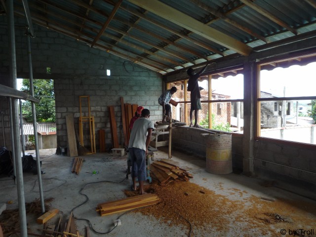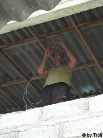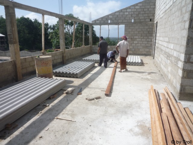 Nun kommen die Dachdecker. Das Dach wird diesmal aus Eternitplatten gemacht. |