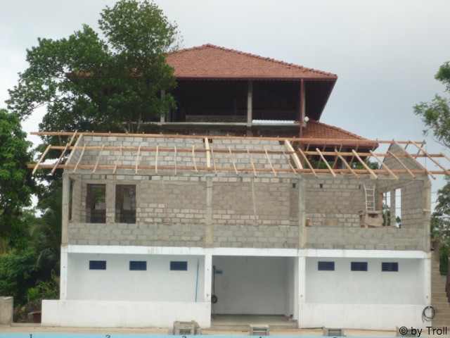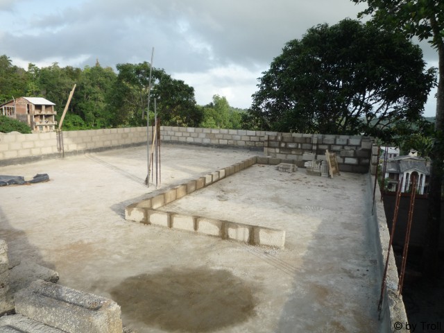 Ziemlich bald, nachdem die Decke fertig war, legten wir die erste Steinreihe, damit das Wasser nicht die Wände herunter läuft.