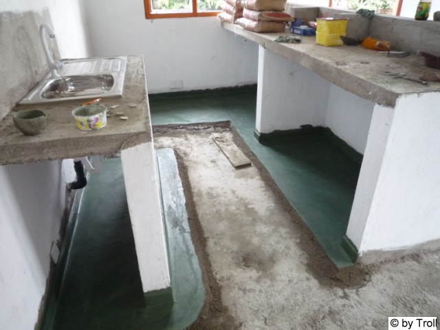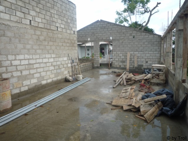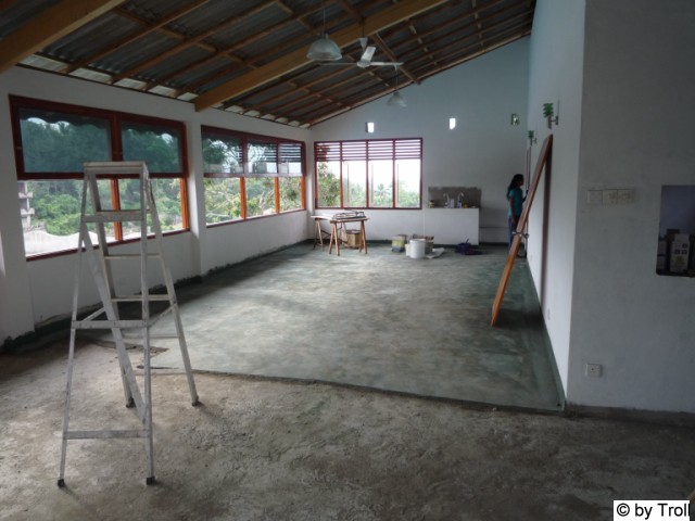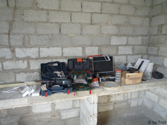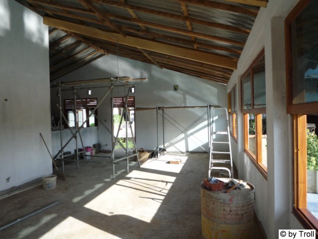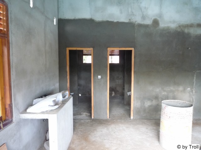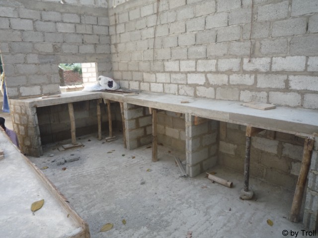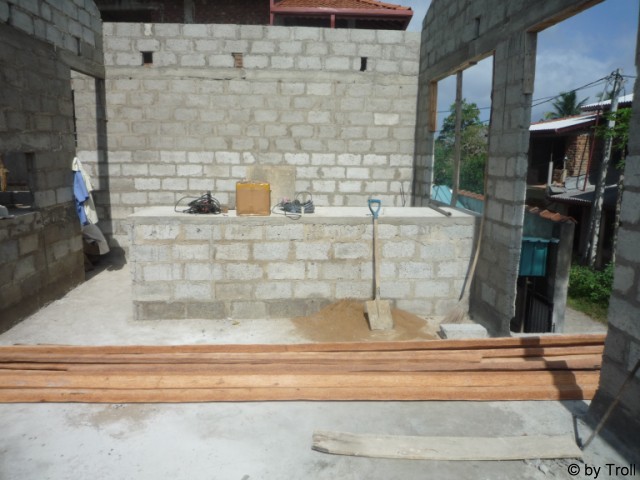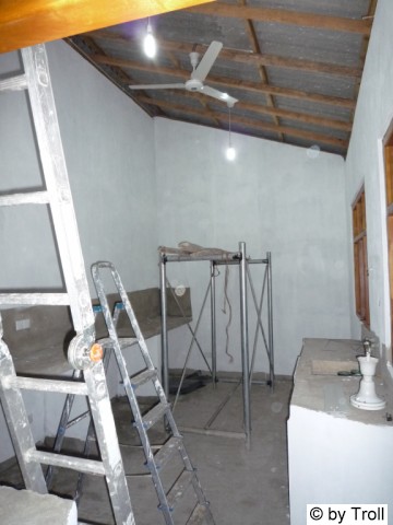 Hinter der Wand mit dem Loch, die Küche. Rechts der Eingang. Vorne im Bild wird bereits mit dem Tresen begonnen. |