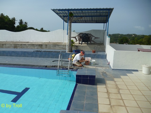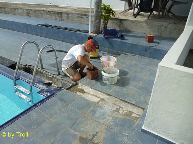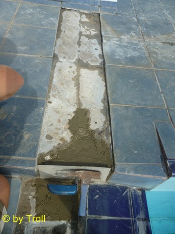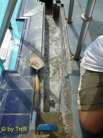 Da beim Bau des Skimmers gefuscht wurde, versuchen wir nun dies zu beheben. Der Übergang vom Pool zum Skimmer lässt Wasser durch. An vielen Stellen. Von unten kann man gut sehen, das steter Tropfen den Stein hölt. Es muss etwas geschehen. Zuerst müssen die Fliesen ab, um zu sehen wie es darunter aussieht. Das Ausmaass kommt ans Tageslicht. Fast nur Sand - viel zu wenig Zement. Stellenweise richtige Hohlräume. Die sandigen Stellen haben wir als erstes mit Zement versiegelt. Auch die Hohlräume haben wir zementiert. Anschließend haben wir den Skimmer mit Glasfasermatte ausgelegt und auch den Rest haben wir mit Epoxidharz ausgeschmiert. |