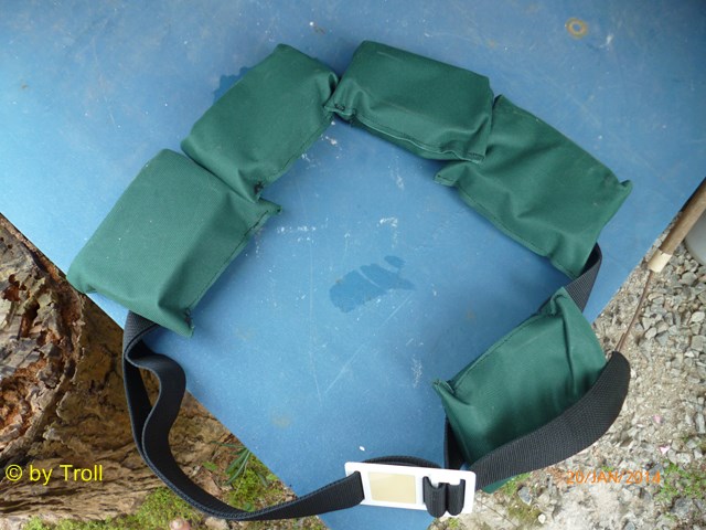 So habe ich Altmetall in Epoxidharz gegossen und es hart werden lassen. Wobei beide Komponenten des Harzes flüssig sind und bei richtiger Mischung ist das Zeug nach 10 Minuten hart. Dann hat Jacky Taschen genäht und dort haben wir die gegossenen Teile hineingesteckt. Die Taschen dann auf einen stabilen Gürtel gezogen und fertig war die Laube. Nun habe ich gute 5KG um den Bauch und komme gut runter auf den Grund.