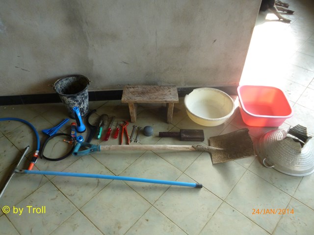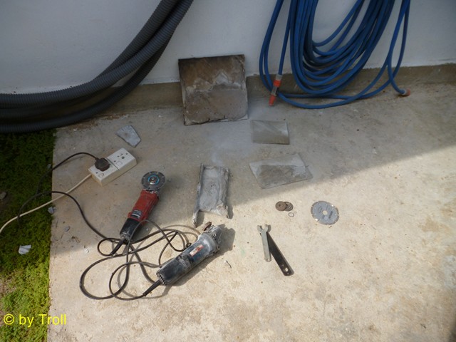 Da wir nicht genug neue Fliesen hatten, musste von den alten der Fliesenkleber runter, damit sie neu eingeklebt werden konnten.Das geschah hier mit einer Flex |