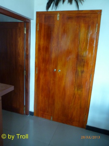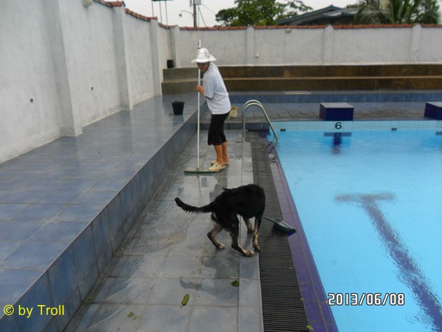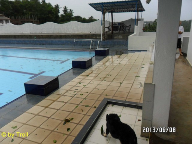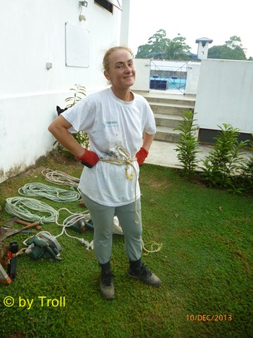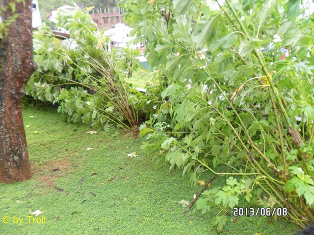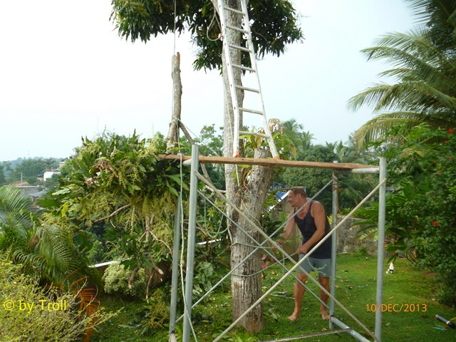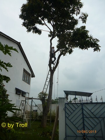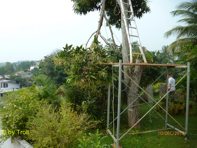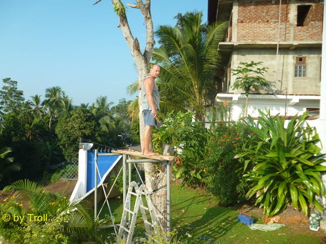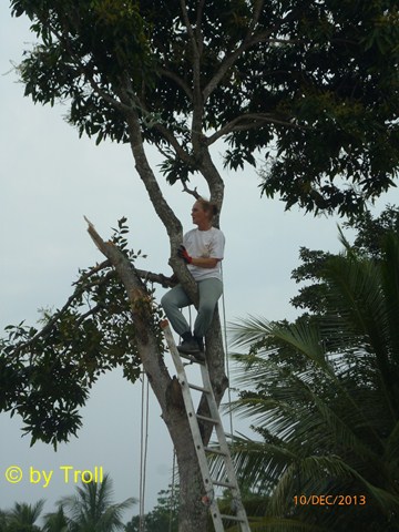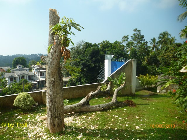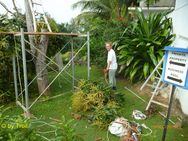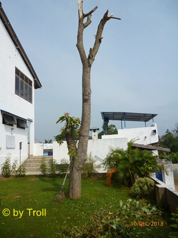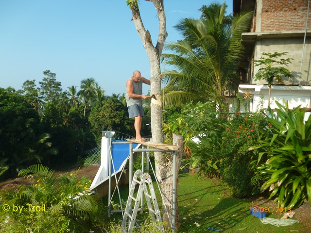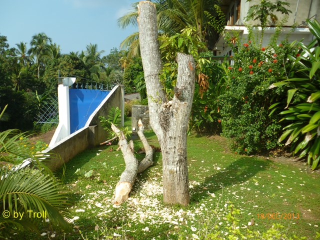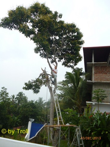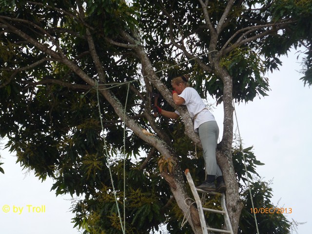 Bevor das Jahr 2013 zuende geht, wollen wir noch schnell einen Baum kürzen. Er macht nur Dreck. Erst die Blüten die er überall hinschmeisst und die wir dann wegfegen dürfen, dann die Früchte die von den Tieren gegessen werden, wobei die Reste ebenfalls irgendwo hingeschmissen werden, die Ameisen die ihre Nester darin bauen und überall herum laufen und nicht zuletzt die Vögel die nach getaner Speise das ganze Pooldeck zuscheissen. Das nur einige Gründe.