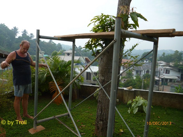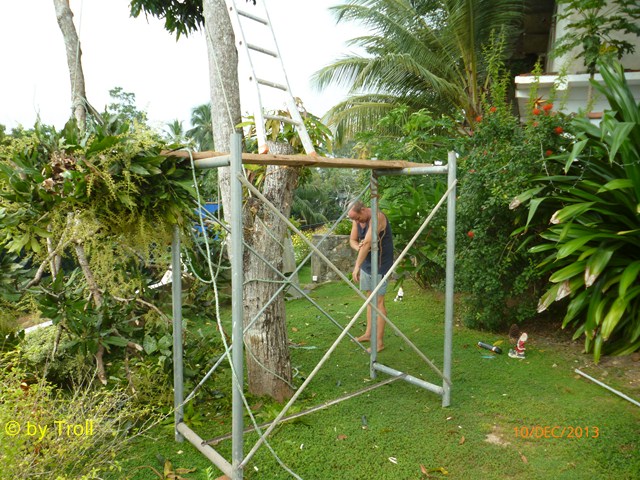 Als erstes wird ein Gerüst aufgestellt. Darauf werden als Stehfläche Kokosbalken gebunden. |