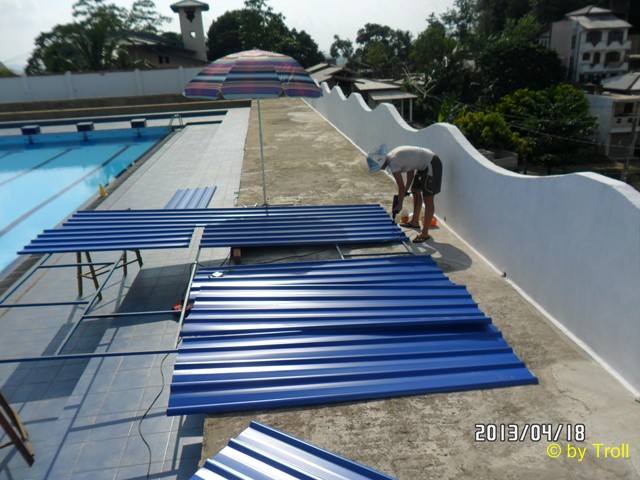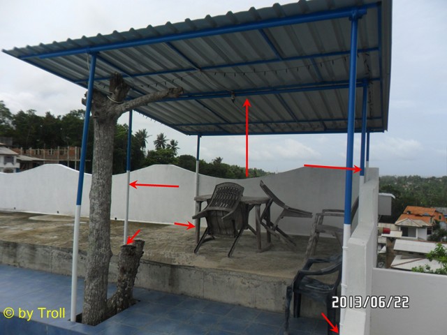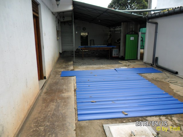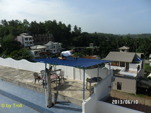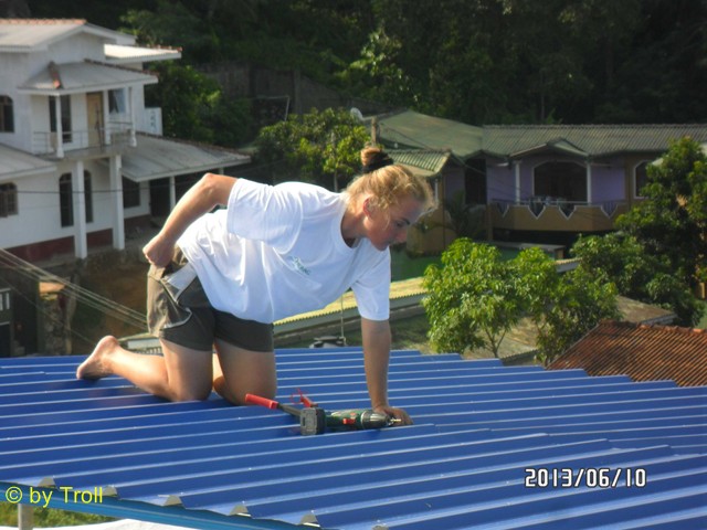 Nach dem die Plane als Dach auf dem Gerüst langsam aussah wie ein Lazarett, machten wir uns daran ein richtiges Blechdach zu montieren. |