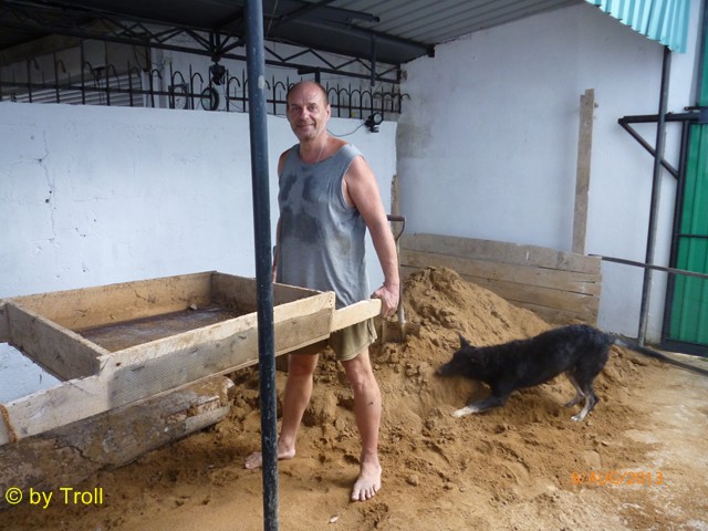 Nun gehts ans Verputzen. Dazu braucht man gesiebten Sand, Der Sand wird aus einem Fluss geholt und ... |