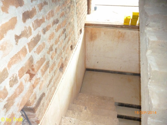 ausgestrichen, dann als Füllmaterial mal wieder Schutt der so anfiel. Die Stufe ist schon fertig.