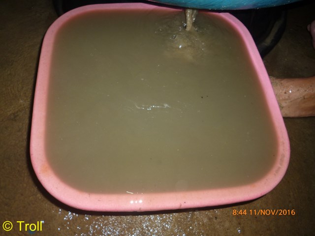 Nun fliest das Wasser aus der Rinne auf das Dach in die andere Rinne in unsere Grube. |