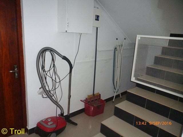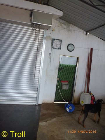 Nach heftigem Regen gibts in der Elektrik vom Rolltor immer einen Kurzschluss. Dann muss man das Rolltor mit der Kette von Hand hochziehen. Jetzt haben wir den Strom von einem anderen Kreislauf geklaut.. |