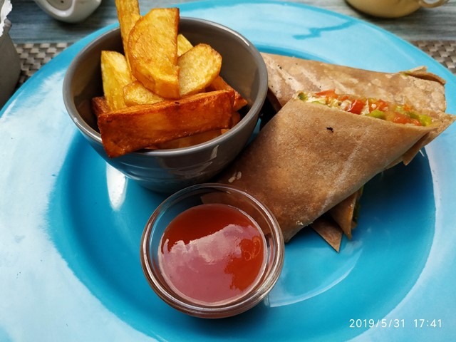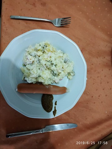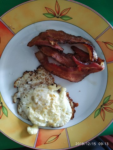 So sieht Fruehstueck aus....Ei mit crossem Schinken fuer mich. |
