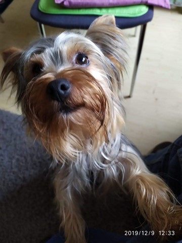 Hier praesentiert er stolz sein neues Hundegeschirr. |