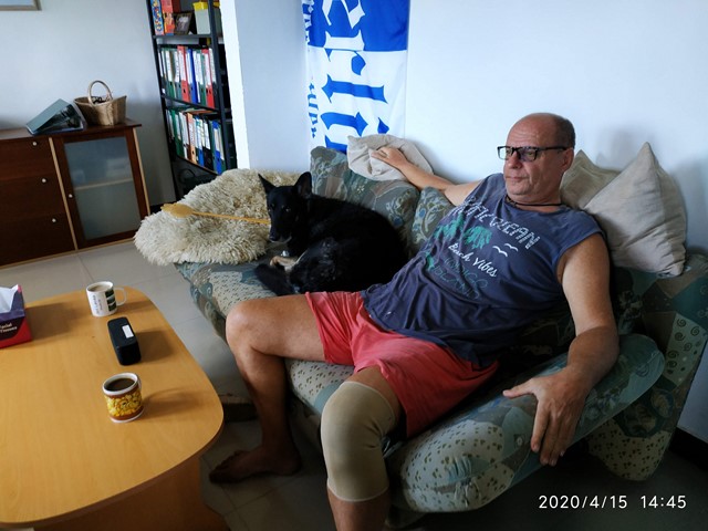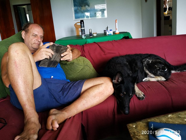 Kissen,der Daddy mit Tablet und Rex, der auf seine Streicheleinheiten wartet.