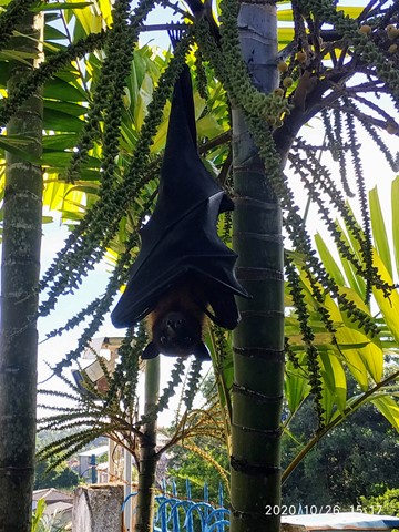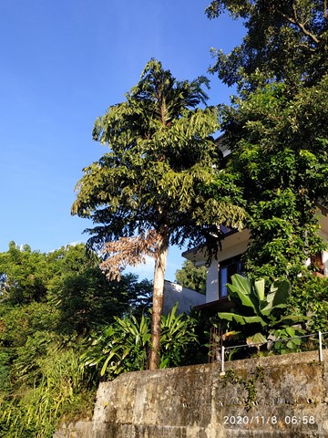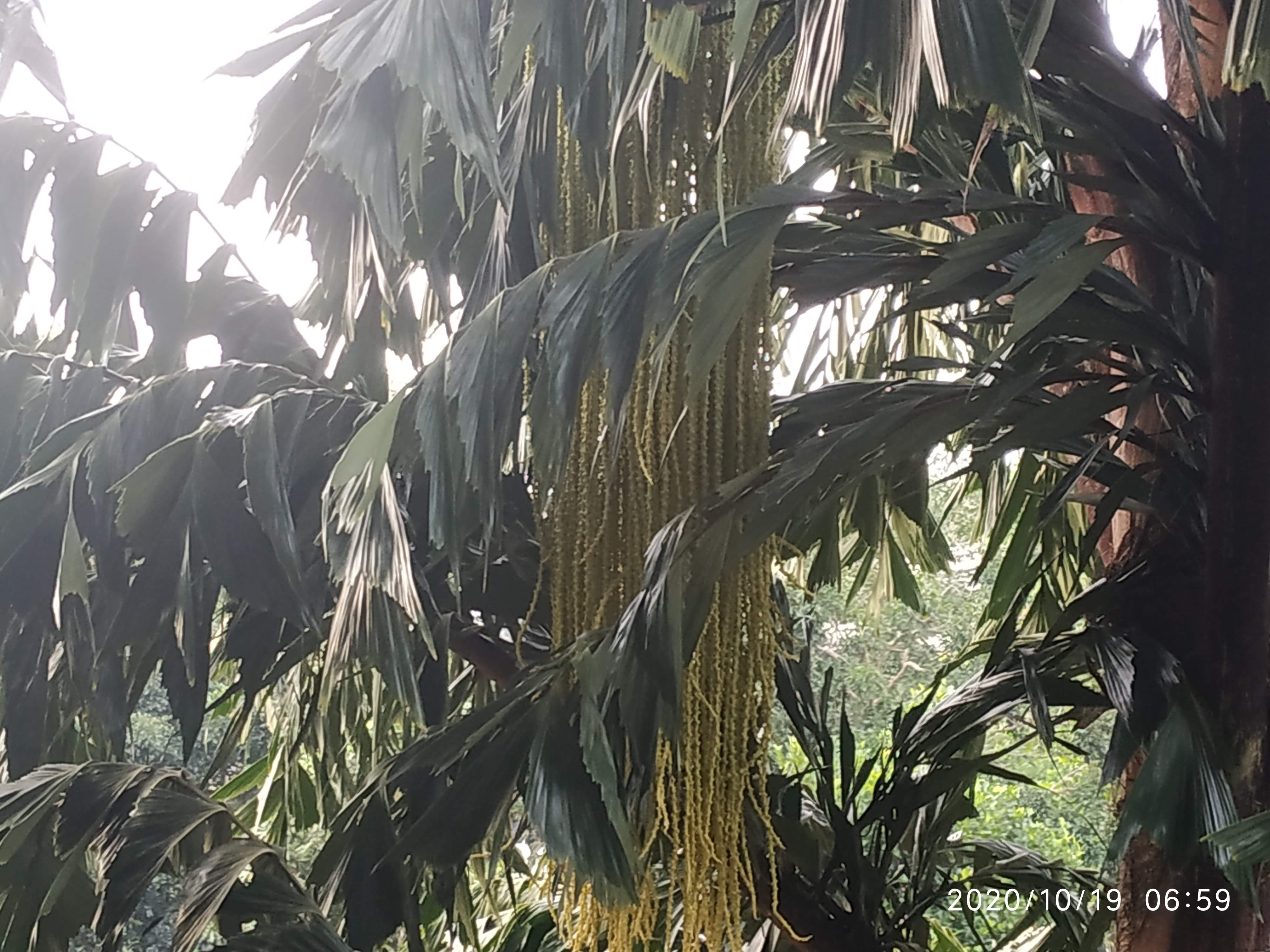 Die herunter haengenden Rasterlocken, sind die Blueten der Fischschwanzpalme.