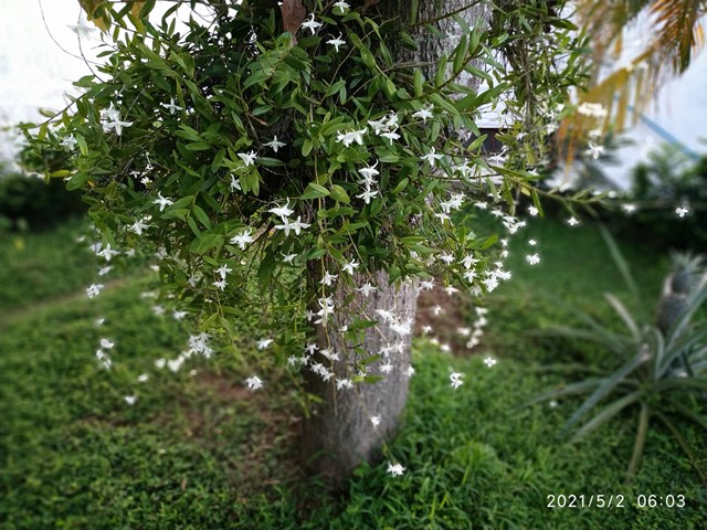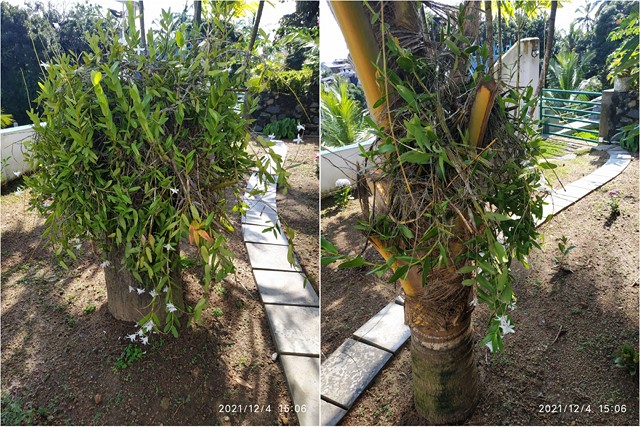 Die Orchideen haben ihren Platz auf dem Baumstumpf und in der Palme gefunden.