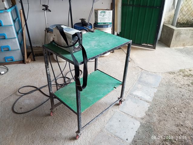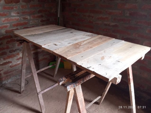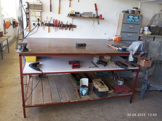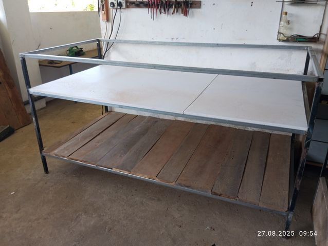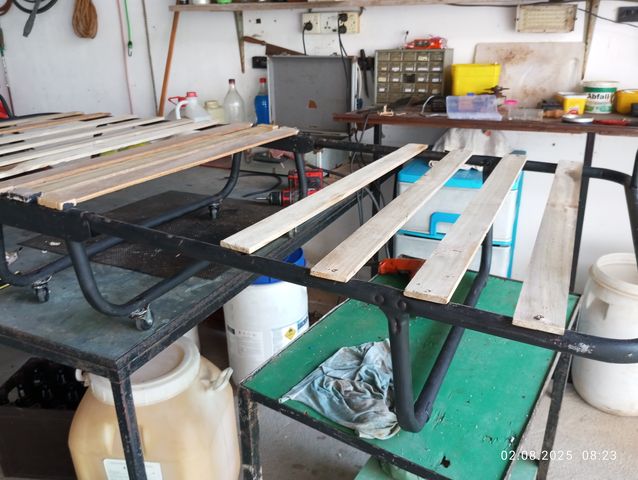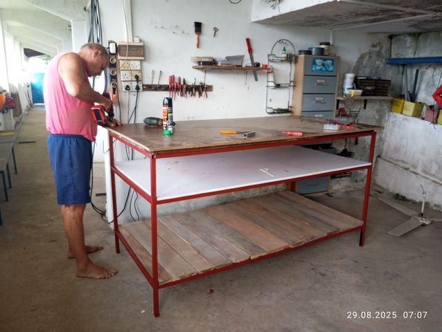 | Der Erbauer dieser Werkbank hat diese mit bis zu 10cm langen Naegeln gebaut. | Gestell von mir geschweisst, Bretter zugesaegt was noch da war, quasi als Stauraum. |