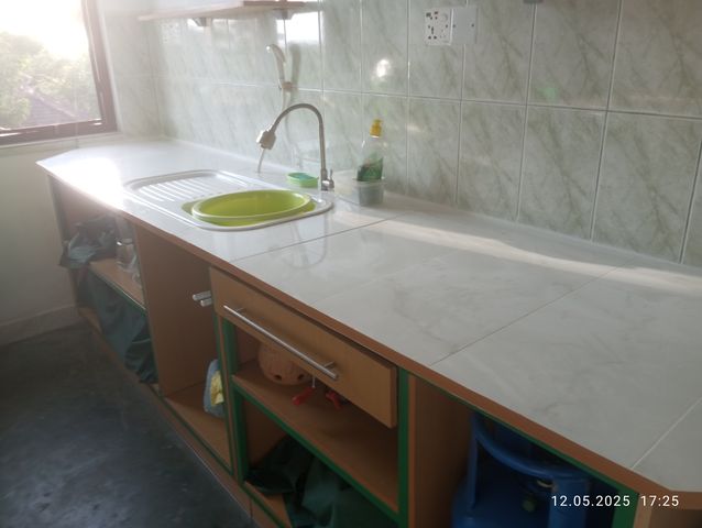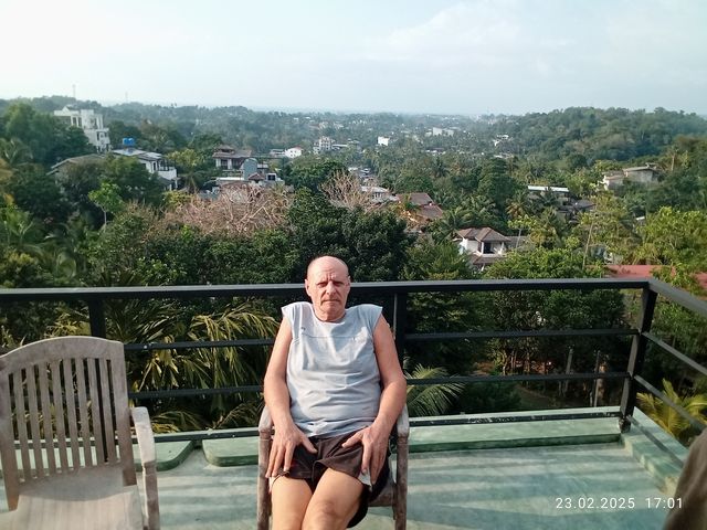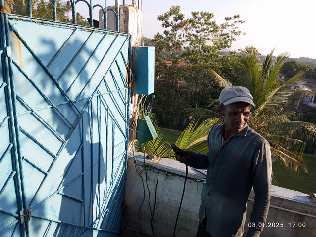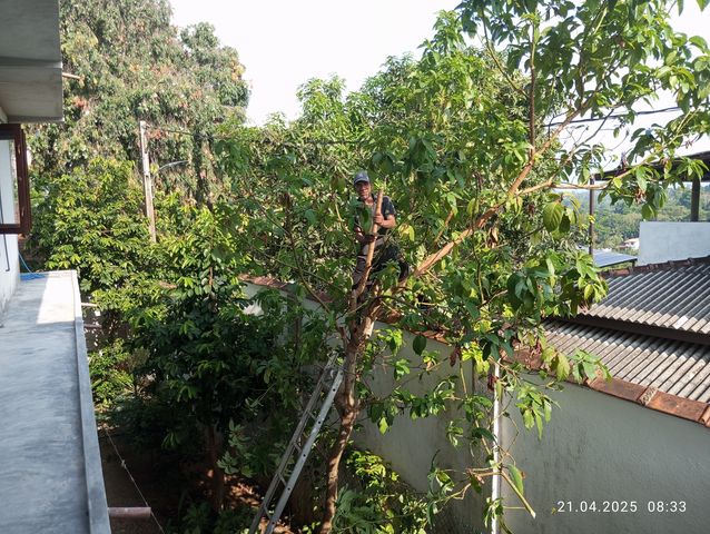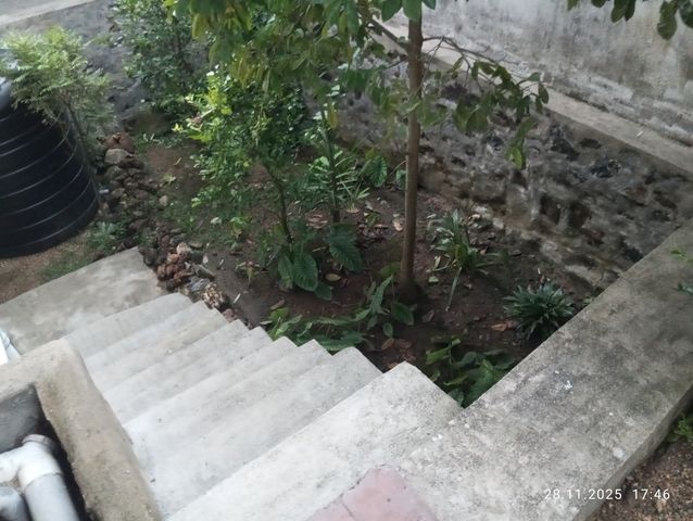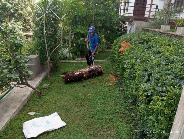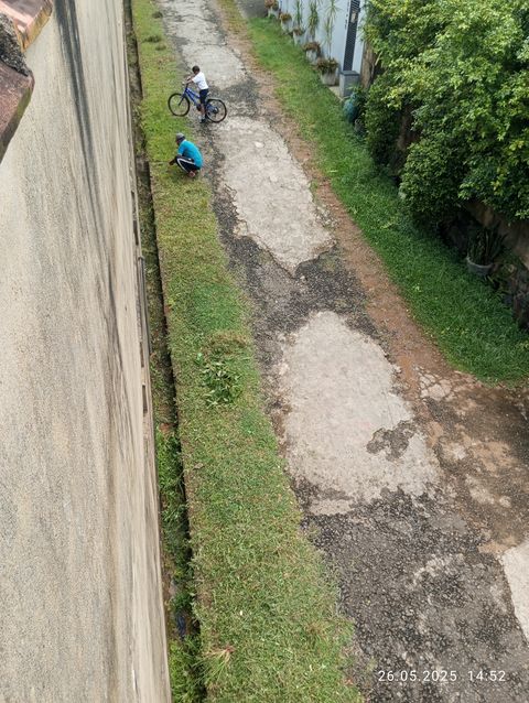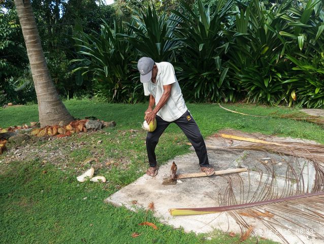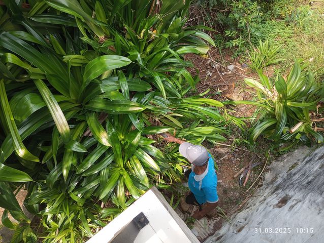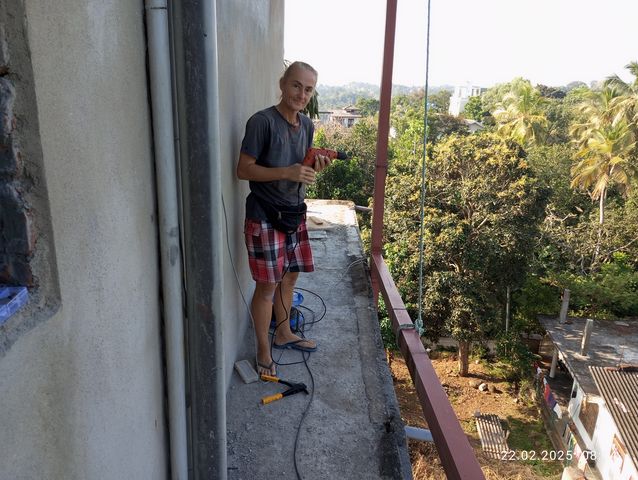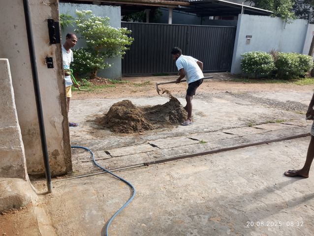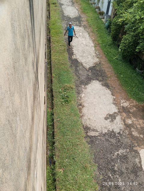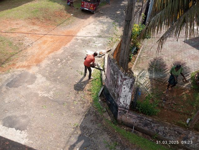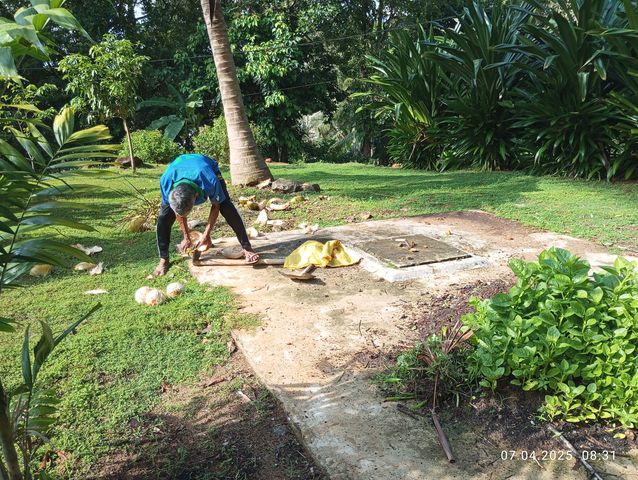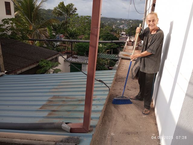 Unser Hausmeister, Sisira, kaempft mit dem Unkraut vor dem Haus. |