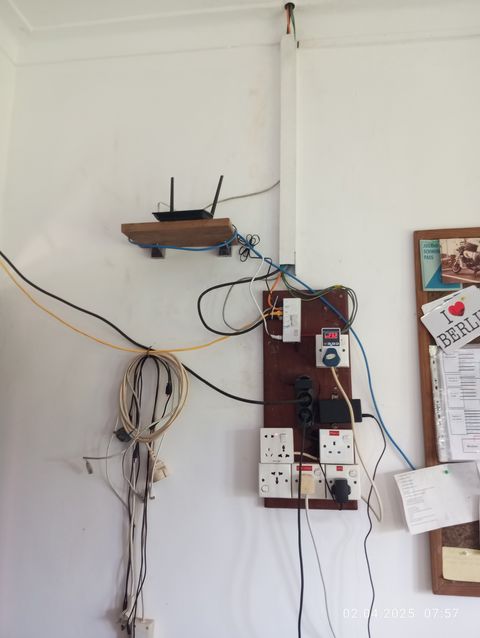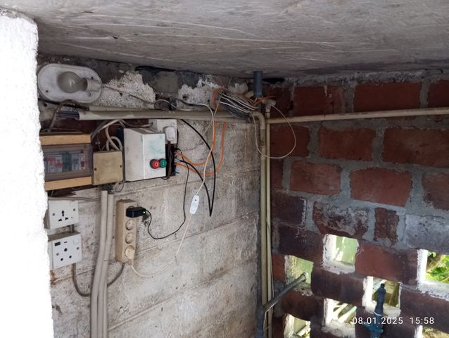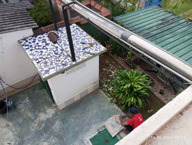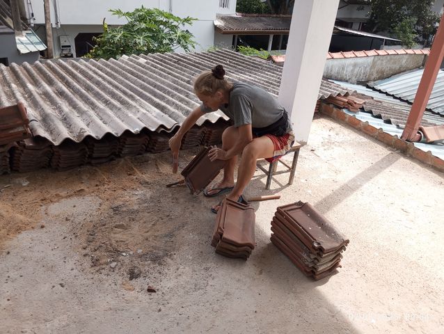 | Mal wieder ein Malheur im Schaltschrank, der uns den Strom nahm. | Jacky putzt die aufgehobenen Ziegel von damals fuer das neue Vordach. Video 30 |