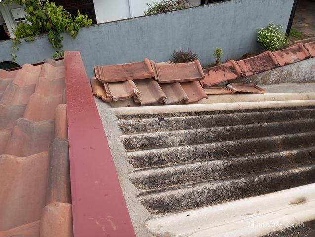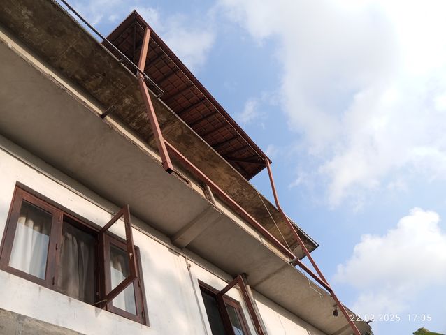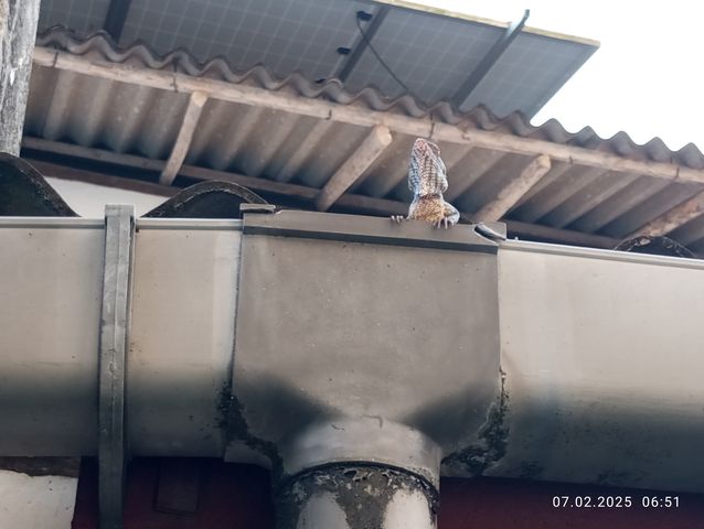 |  | Hier nochmal das Ergebnis, als ich beim Anbringen der Dachrinne durch die Plattform des Geruestes gerauscht bin. Nun alles wieder repariert und nutzbar. |