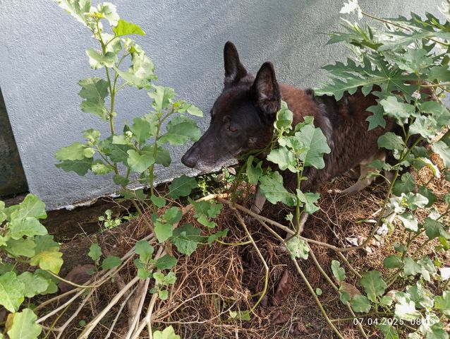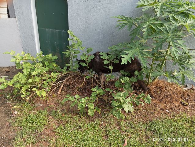 | Rex hat fuer sich eine neue Sorte Gruenzeug entdeckt. | Der Herr isst jetzt die Blaetter der Auberginenpflanze. Rex beim Stromern. Video 13 |