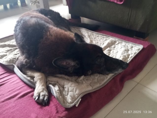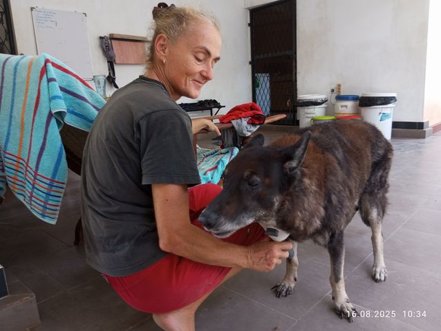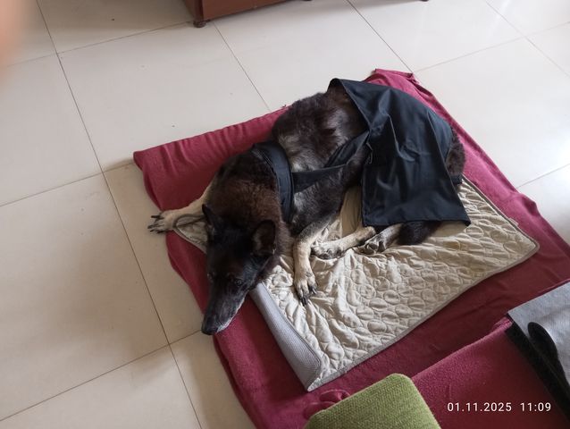 | ... weil er sich immer daran lecken will. Jacky hat noch einen Schutz gebaut / genaeht. | Bei Rex so alles OK, nur mit dem Aufstehen klappt es nicht mehr so gut. Video 33 |