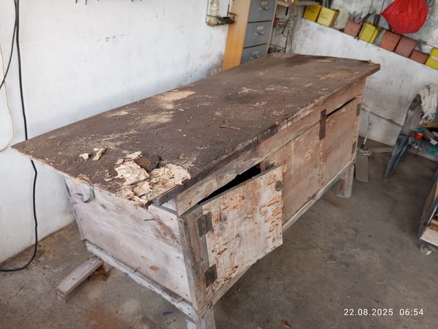 | Ohje, die Werkbank hat nach 15 Jahren ausgedient. Die Werkbank musste von unten nach | oben zerlegt werden. Das einzig brauchbare waren die Bretter unter der obersten Platte. |