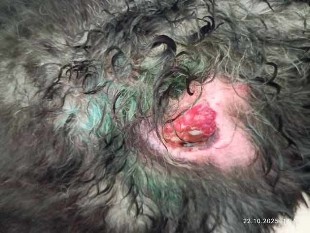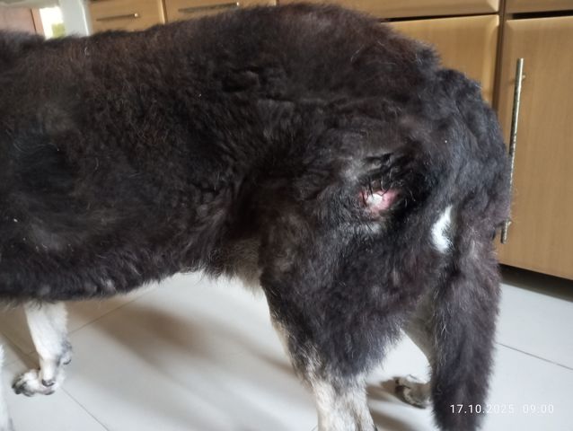 | Bei Rex hat sich ein Ekzem gebildet. Zu spaet gesehen. Die Wunde wurde dann... | ... genaeht. Nun soll sie heilen in den naechsten Wochen. Ist aber nicht so einfach ... |