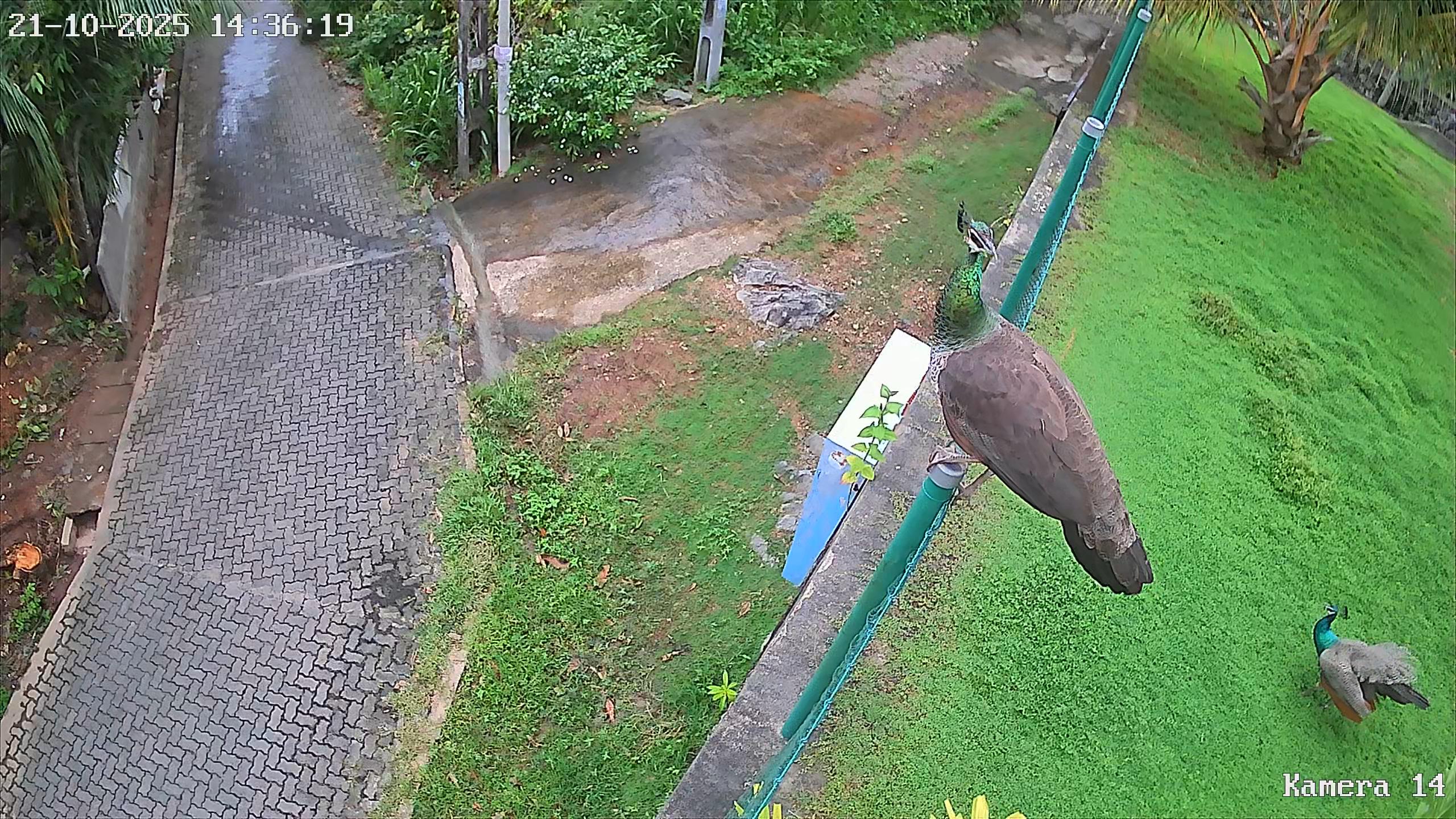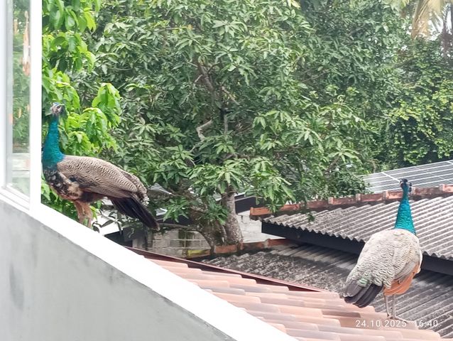 | Es ist wohl Pfauenzeit. Man sieht sie ueberall. Auf dem Parkplatz, auf unseren Daechern | ... und Terrassen und sogar im Haus. Leider scheissen sie alles voll. Video 34 |