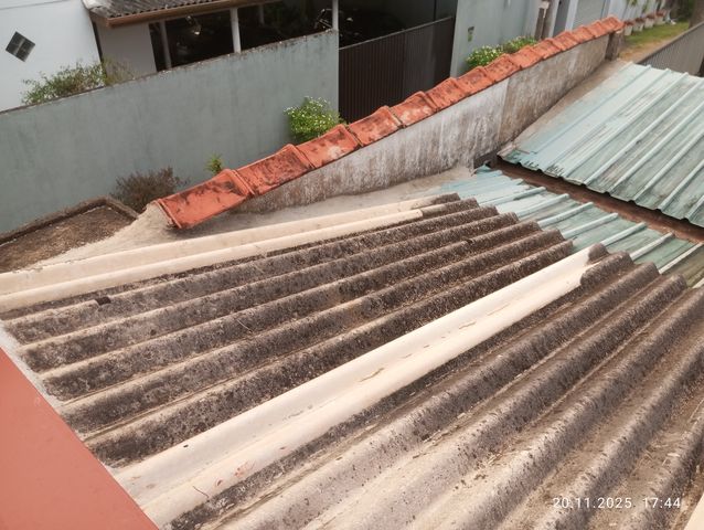| Als naechstes das Schwalbendach. Der dort raufprasselnde Regen macht laute ... Video 25 | ... Geraeusche. Jetzt bot sich die Gelegenheit, die Eternitplatten drauf zu legen... |