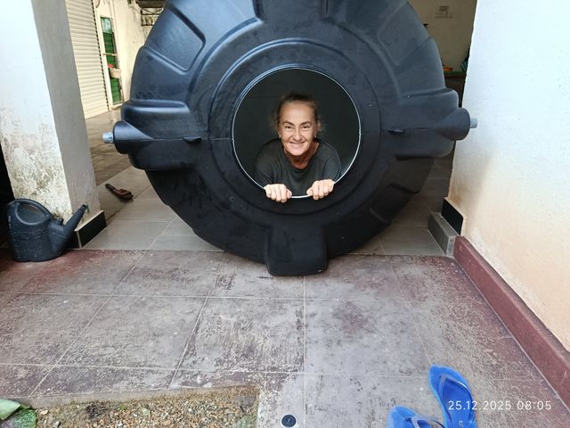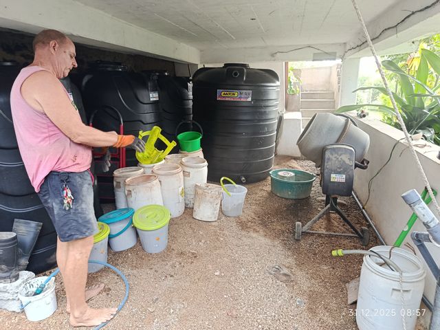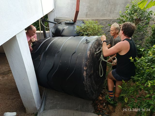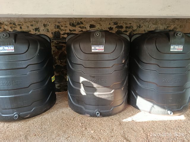neuen Tanks sind da,um weiteres Regenwasser | zu sammeln. Nun muessen