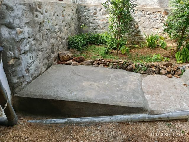 | Auf diesen Steinen stand der Tank. Er muss nun hoeher gesetzt werden, weil andere Tanks... | ...mit angeschlossen werden. Deshalb ein neues Podest aus Zement. Alles ist vorhanden. |