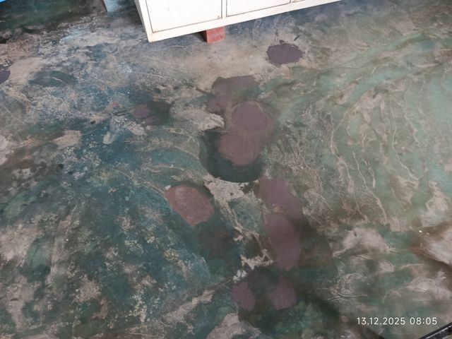 | Obwohl der Fussboden aus Beton ist, scheint er doch nicht ewig zu halten. | Ausbesserungen waren von Noeten. Mal wieder in der Herrengarderobe. |